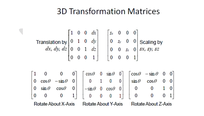 La ventaja de ello es que las matrices que se utilizan para ello son siempre las mismas, la desventaja es que hablamos de un mínimo de 16 multiplicaciones y 12 sumas por transformación de un único vector. Esto si se hace desde una CPU convencional es un overkill, de ahi a que se necesitaran ya desde el principio unidades dedicadas. Las cuales en sus inicios, y hasta la llegada de la integración a muy gran escala (VLSI) eran placas enteras de componentes que solían manejar las instrucciones complejas que las CPU no puede o son demasiado lentas para ejecutarlas con la suficiente velocidad. Dichas unidades solían recibir el nombre de Matrix Multiplier Unit, Matrix Accelerator Processor y muchos otros distintos, pero todos ellos eran distintos. Todos los objetos que forman parte de la escena tridimensional se escalan, rotan y desplazan teniendo en cuenta la perspectiva de la cámara o del espectador.